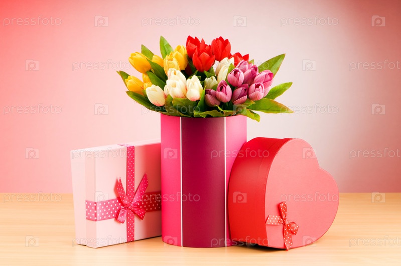 Подарочные коробки и букет тюльпанов на столе