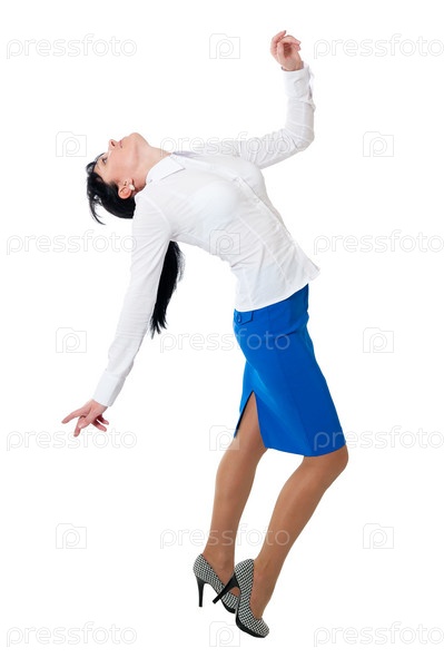 Молодая девушка в синей юбке и блузке на белом фоне
