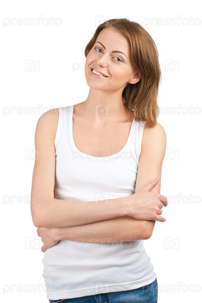 Девушка в белой майке и джинсах на белом фоне