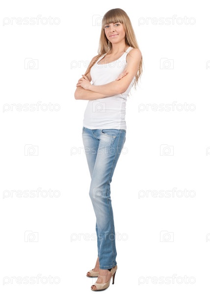 Девушка в белой майке и джинсах на белом фоне