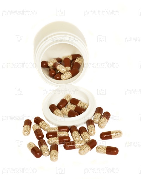 Пузырек с рассыпавшимися таблетками на белом фоне