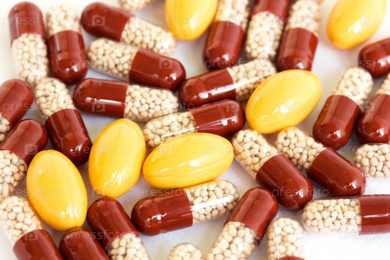 Фон из красочных желтых и красных медицинских капсул
