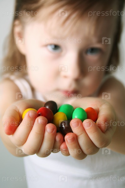 Разноцветные конфетки, которые держит в руках маленькая девочка