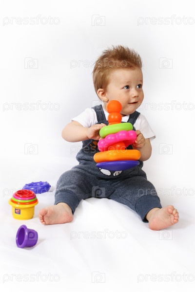 Мальчик с игрушками на белом фоне