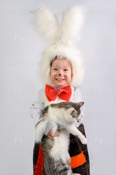 Маленькая девочка в костюме зайчика с кошкой на белом фоне