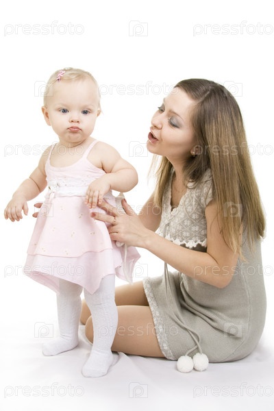 Молодая мама с маленькой дочкой на белом фоне