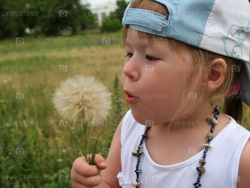 Маленькая девочка дует на одуванчик