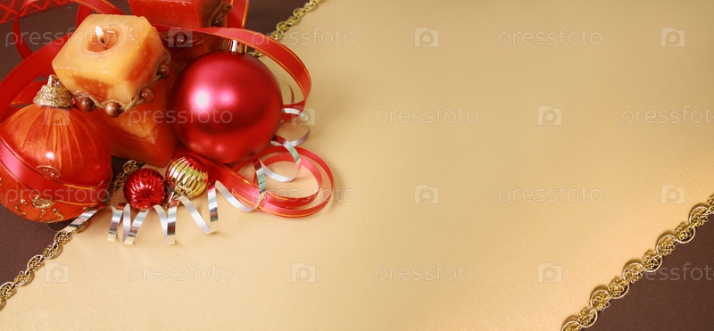 Новогодние елочные шары, лежащие на открытке