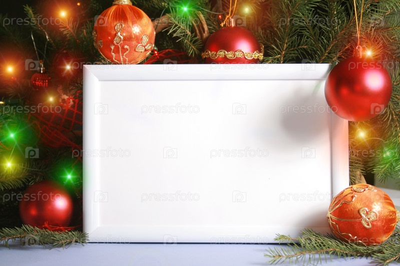 Белый лист бумаги, вокруг которого елочные украшения