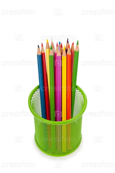 Корзинка с цветными карандашами на сером фоне