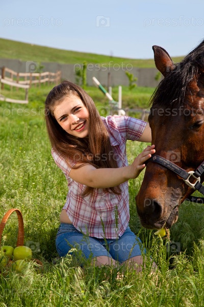 Девушка кормит лошадь яблоками