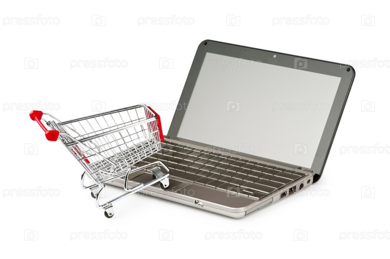 Ноутбук и металлическая корзина для покупок