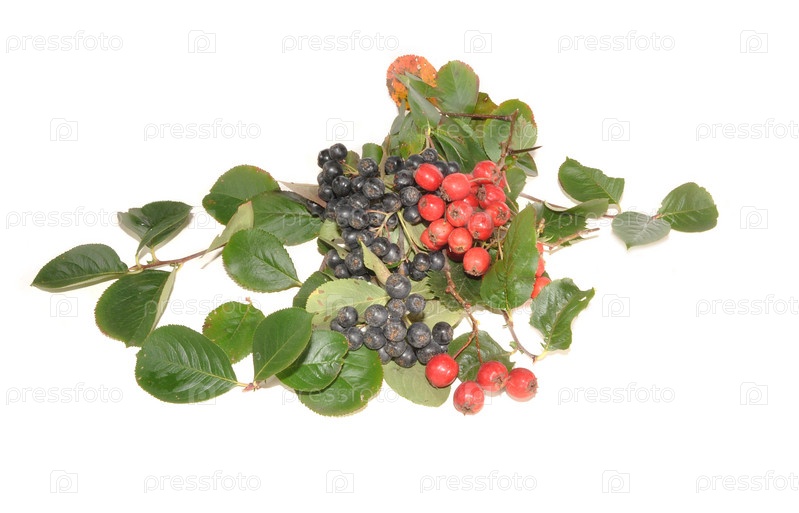 Ягоды рябины и боярышника с листьями на белом фоне