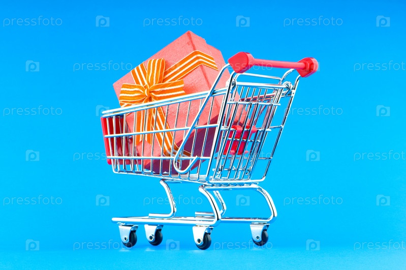 Подарочная коробка в тележке для покупок на голубом фоне