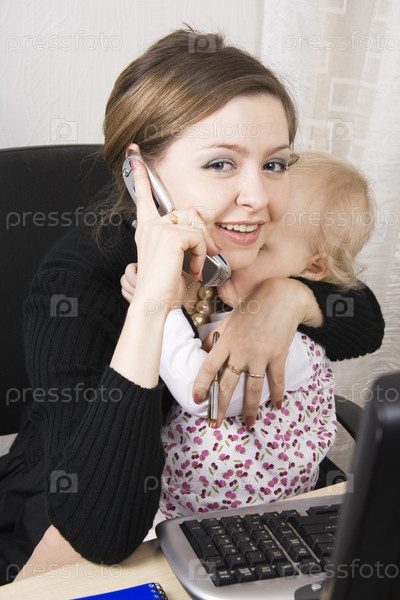 Мать с ребенком на руках за рабочим столом
