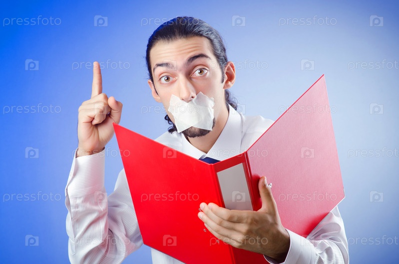 Бизнесмен с залепленным пластырем ртом и поднятым вверх указательным пальцем
