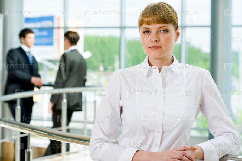 Портрет привлекательной женщины, смотрящей на камеру с общающимися мужчинами на заднем плане