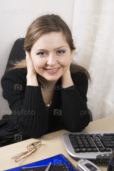 Улыбающаяся деловая женщина сидит за рабочим столом