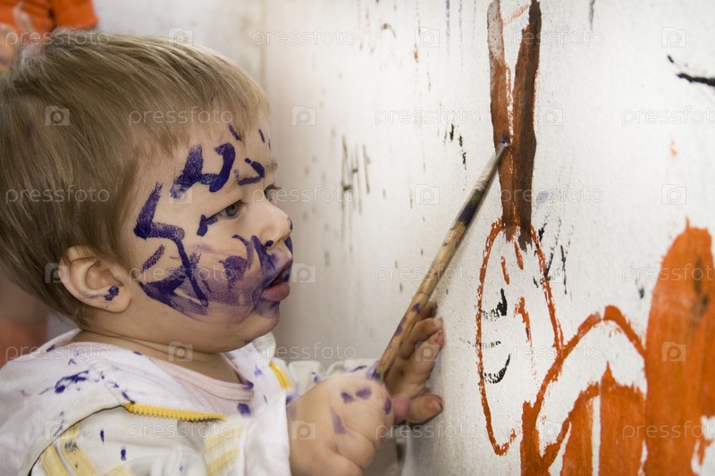 Маленький мальчик с раскрашенным лицом рисует на стене красками