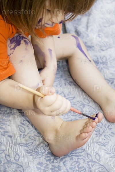 Девочка красит краской ногти на ногах