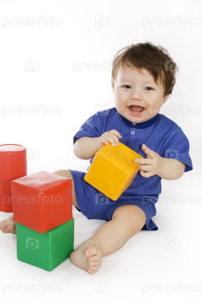 Маленький ребенок играет с цветными кубиками