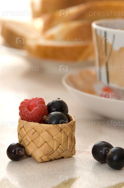 Ягоды малины и черной смородины в маленькой декоративной корзине