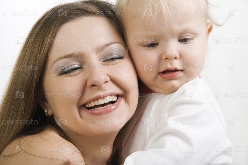 Молодая мама с маленькой дочкой на белом