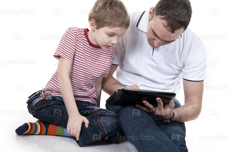 Отец и сын сидят на полу с компьютером, изолированы на белом