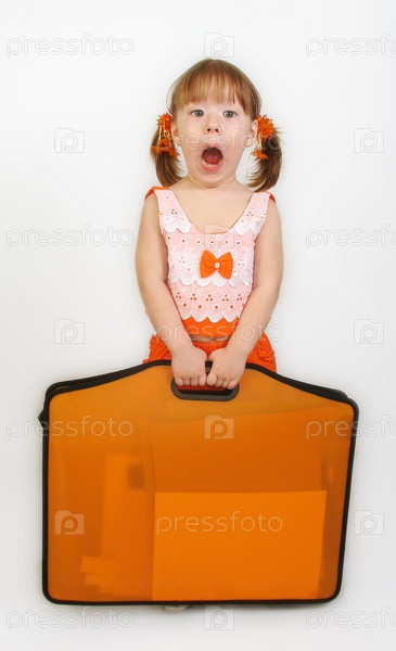 Портрет девочки с открытым ртом и с большой оранжевой сумкой в руках
