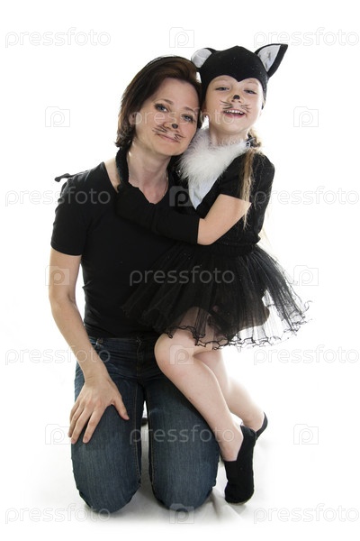 Мама и дочка в костюме кошки, изолированы на белом