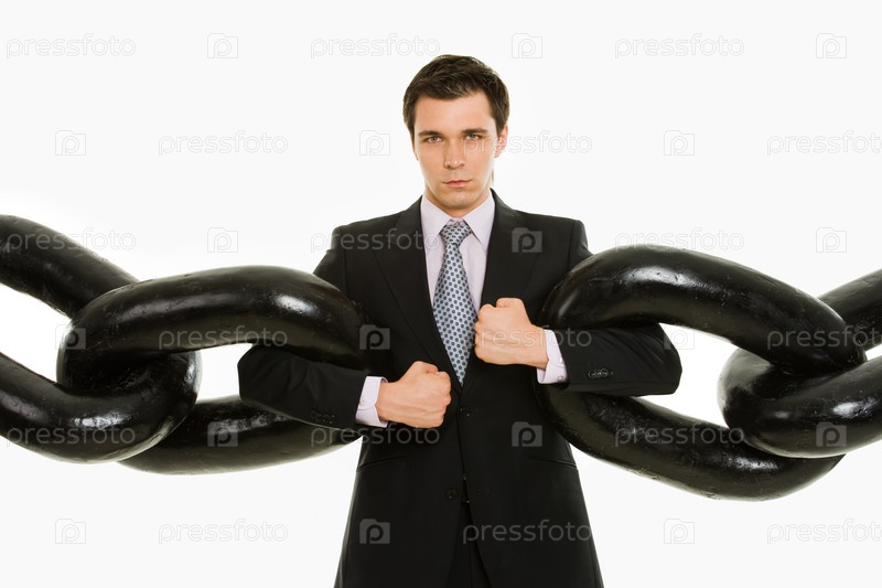 Портрет влиятельного бизнесмена с несколькими разделами огромной цепи на белом фоне