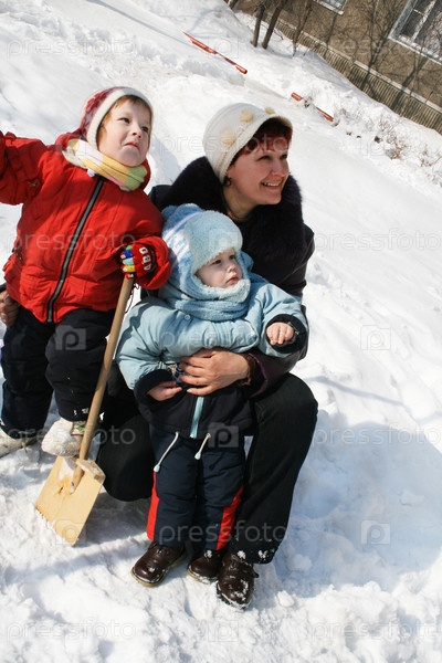 Мама с двумя детьми во дворе