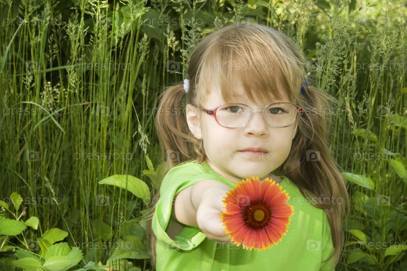 Маленькая девочка с красным цветком среди травы