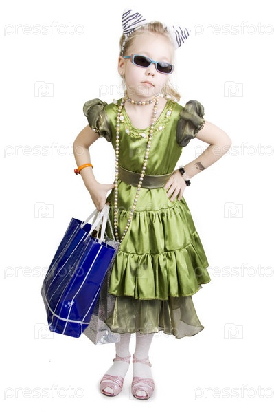 Смешная наряженная девочка в темных очках и с пакетом