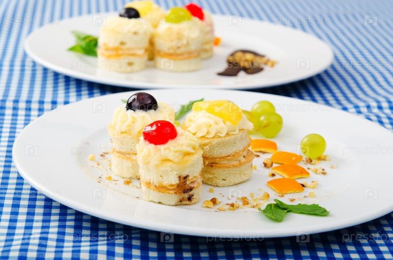 Пирожное на белых тарелках стоят на столе
