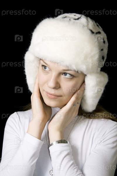 Портрет молодой красивой женщины в шапке с ушками на черном фоне