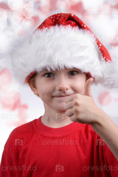 Ребенок в колпаке Санта Клауса показывает жест рукой