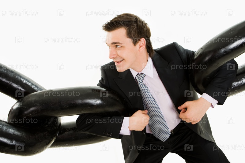 Портрет влиятельного бизнесмена, держащего две части огромной цепи руками на белом фоне