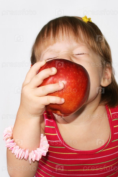 Маленькая девочка кусает красное яблоко