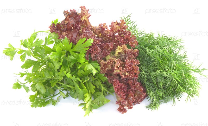 Свежая зелень: петрушка, укроп и листья салата. Изолированные на белом фоне