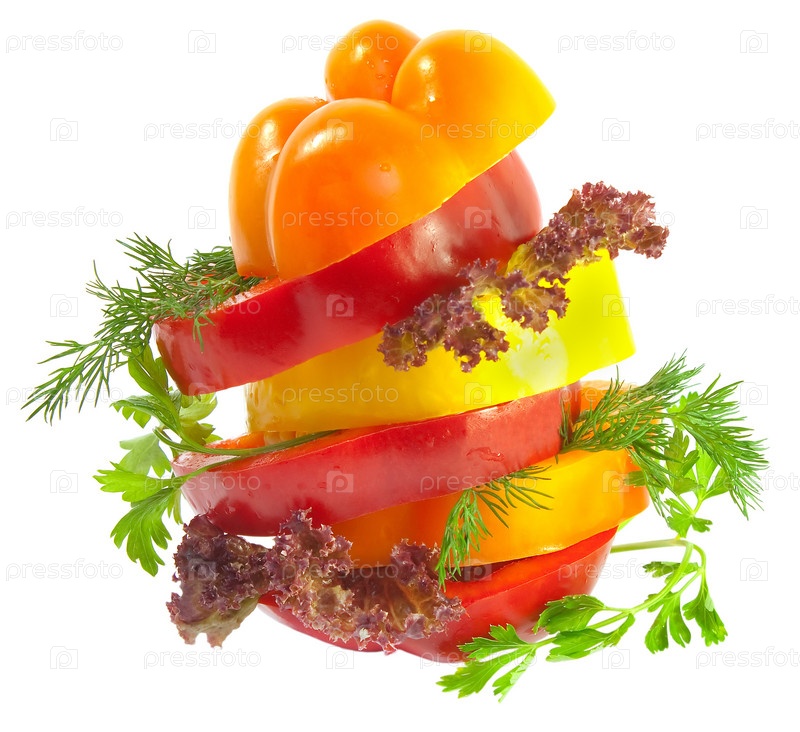 Сэндвич: помидор, сладкий перец, зелень. Изолированный на белом фоне