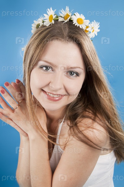 Красивая девушка с венком из ромашек на синем фоне