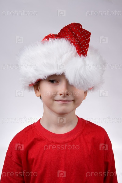 Мальчик в колпаке Санта Клауса и красной футболке. Изолированный на белом фоне