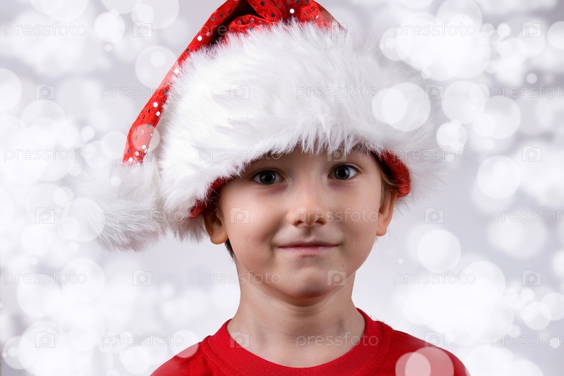 Мальчик в колпаке Санта Клауса. Портрет на белом, размытом фоне