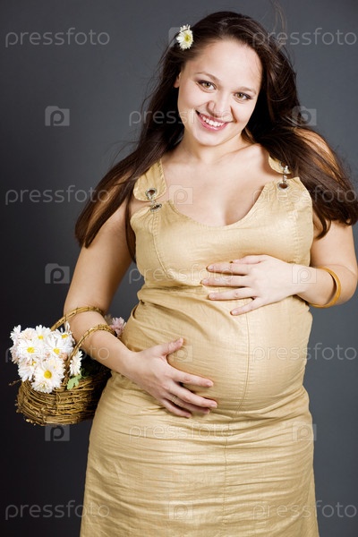 Улыбающаяся беременная женщина с корзинкой цветов