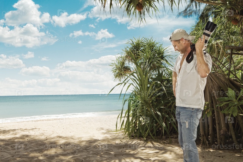 Мужчина с фотоаппаратом на тропическом пляже