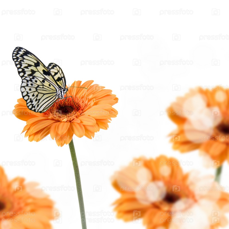 Тропическая бабочка на цветке. Изолированные на белом фоне