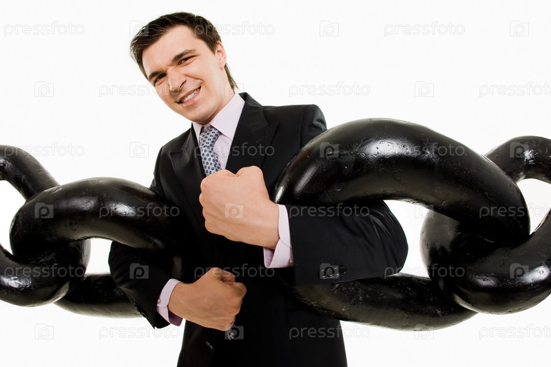 Портрет влиятельного бизнесмена с двумя частями огромной цепи, напряженно смотрящего на камеру