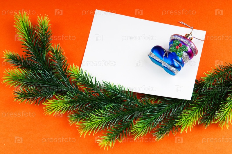 Белый лист бумаги, ветка ели и игрушка