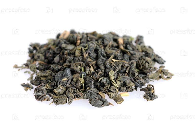 Горка зеленого чая на белом фоне